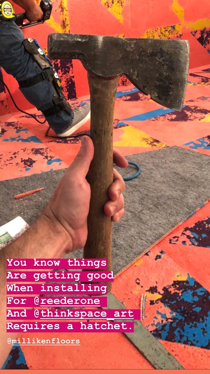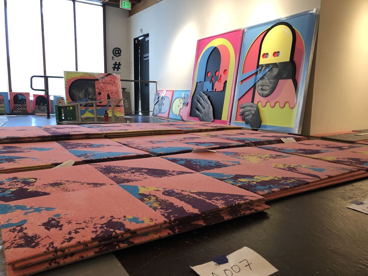 As he prepared for his largest solo show to date, visual artist Michael Reeder (reederone) set out to create an experience that would stay with his audience. His idea began with the floor—treating it as a canvas and contrasting the hardness of wood and concrete with the otherworldly softness of heavyweight Milliken carpet tile. The concept soon expanded to the walls, transforming the gallery at Thinkspace Projects into more than just a striking visual statement. The space itself shifted: echoes softened, the atmosphere thickened, and the gallery became a cocoon where viewers could engage with his work on a more intimate level.